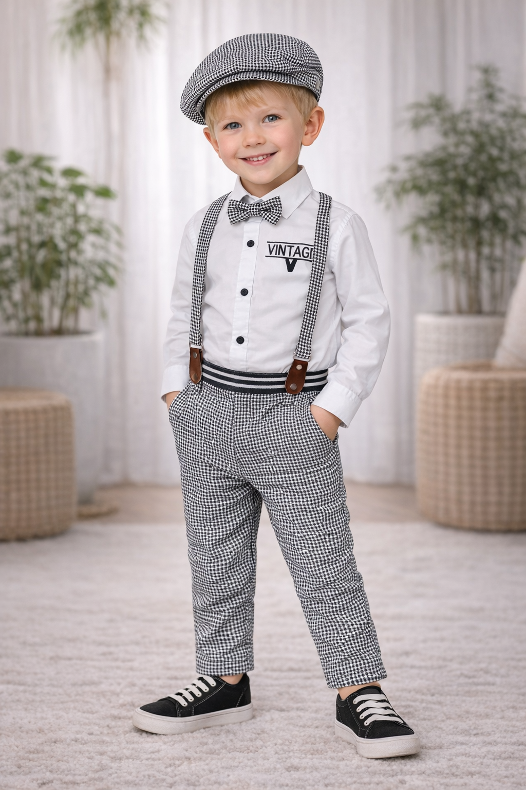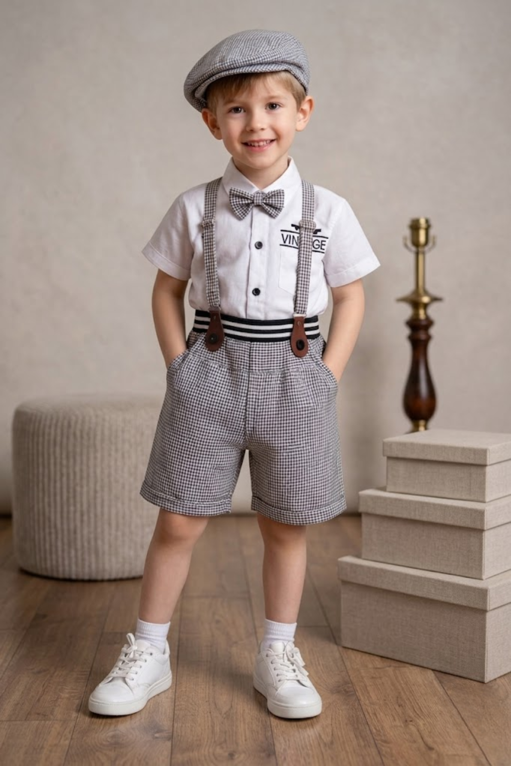 Boys Suspender Outfit Set with Cap & Bow Tie | Kids Vintage Party Wear Dress