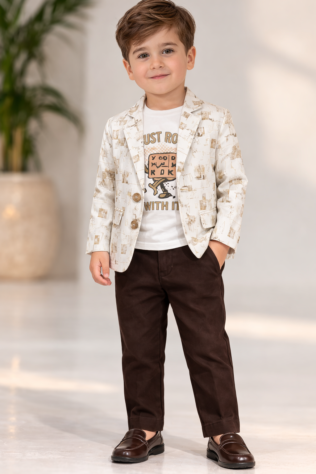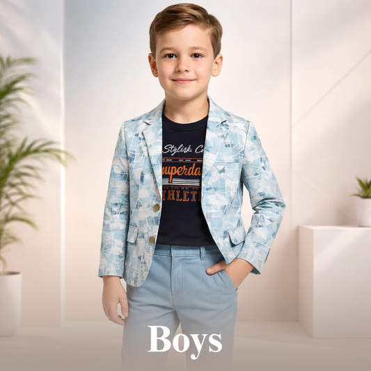 Boys Printed Blazer Outfit with T-Shirt & Pants | Kids Smart Casual Party Wear Set